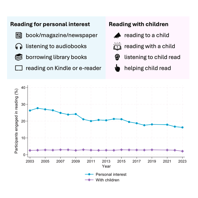 Bone, J. K., Bu, F., Sonke, J. K., & Fancourt, D. (2025). The decline in reading for pleasure over 20 years of the American Time Use Survey. IScience, 113288–113288. https://doi.org/10.1016/j.isci.2025.113288